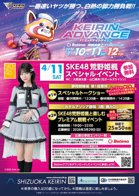 SKE48の荒野姫楓が、2026年4月11日(土)に行われる静岡競輪のスペシャルイベントに出演することが決定しました。
