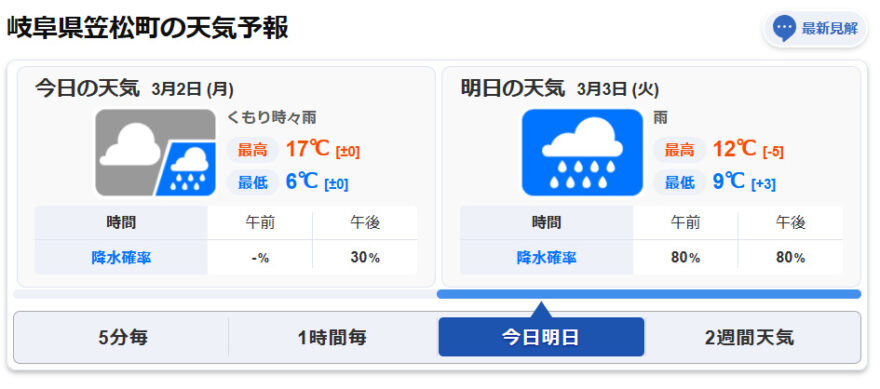 なおイベント当日の笠松の天気予報です…。(出展:ウェザーニュースより)