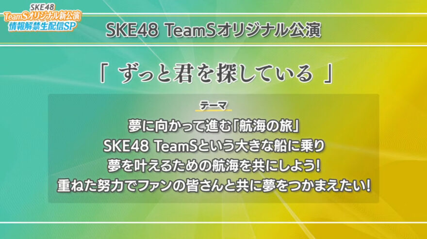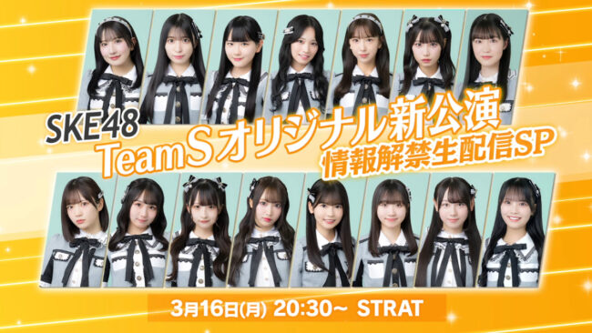 2026年3月16日、SKE48公式YouTubeチャンネルにてSKE48 Team S オリジナル新公演「ずっと君を探している」の情報解禁生配信が行われました。