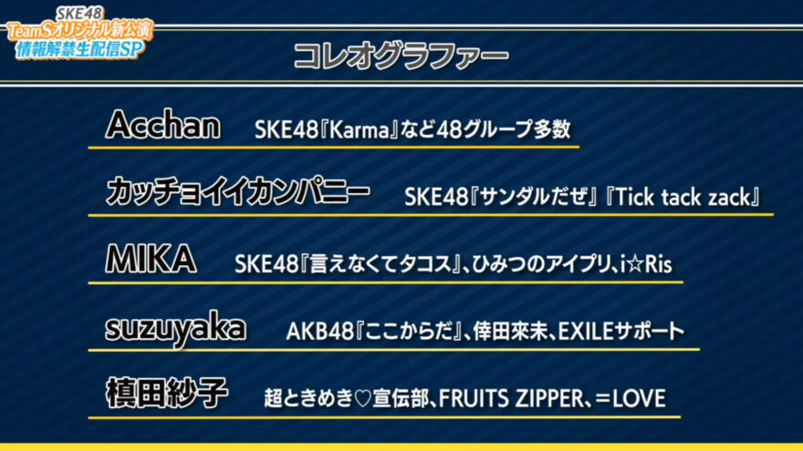 ダンスの振付を担当するコレオグラファー陣も発表されました。48グループでお馴染みの方から、いま話題のアイドルを手掛ける方まで多彩な顔ぶれです。