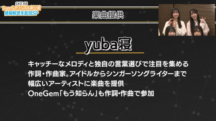 「今、最もバズを生み出す」ヒットメーカー集団。超ときめき♡宣伝部「超最強」では、TikTok songwriter of the Year 2025(日本1位)を受賞。今最も勢いのあるクリエイターチーム。新公演の表題曲「ずっと君を探している」を含む2曲を提供。 - yuba寝