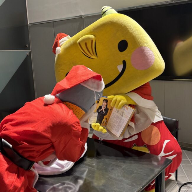 阿鳥主任もサンタクロースの衣装でその説明に聞き入っており、SKE48と縁のあるキャラクター同士が、長野の地でメンバーの布教活動を行うという何ともシュールで温かい光景となりました。